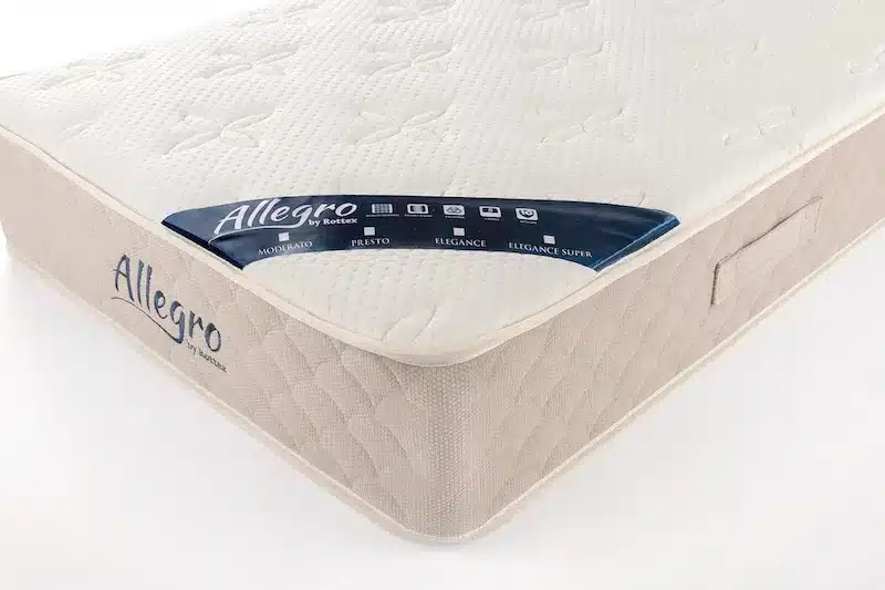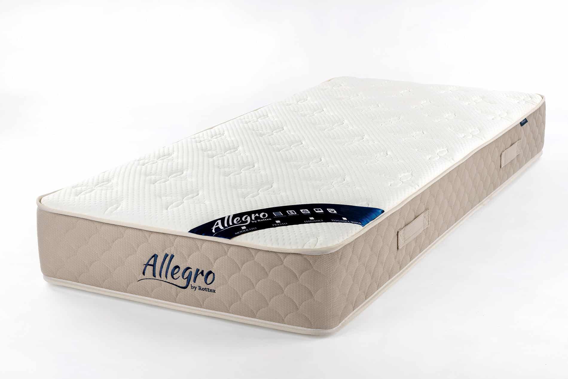 Az Allegro Presto táskarugós matrac a Vivo matracnál egy fokkal keményebb, 4-es jelölésű közepesen kemény matrac. 24 cm vastag 13 cm német edzett 5 zónás táskarugós rendszerrel készülő táskarugós matrac. A kivételes steppelésnek és a felhasznált töltőanyagok minőségének köszönhetően meglepően komfortos felületi lágysággal rendelkezik.